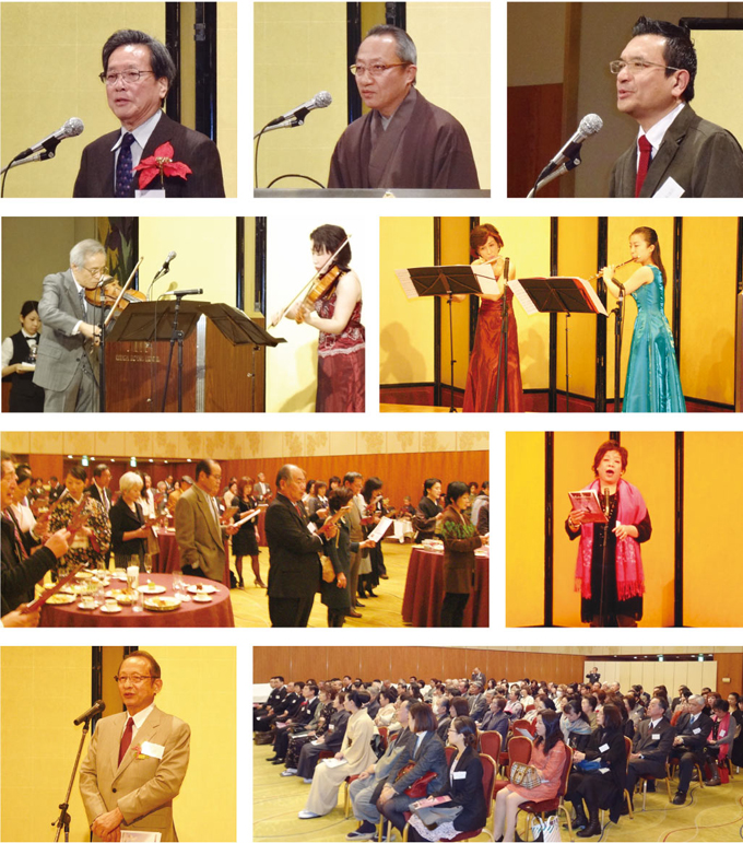 西村順吉・山田園子のバイオリンによる歓迎演奏が荘厳に響く中、端信行会長は「関西文化を盛り上げるためお互いにコミュニケーションを図り文化の在り方を創造しよう」と訴え、役員人事を紹介し参加者と一体となって盛り上げていくよう呼びかけた。